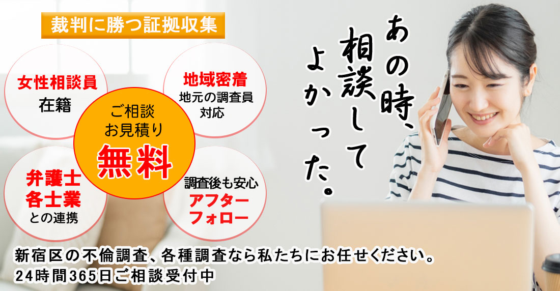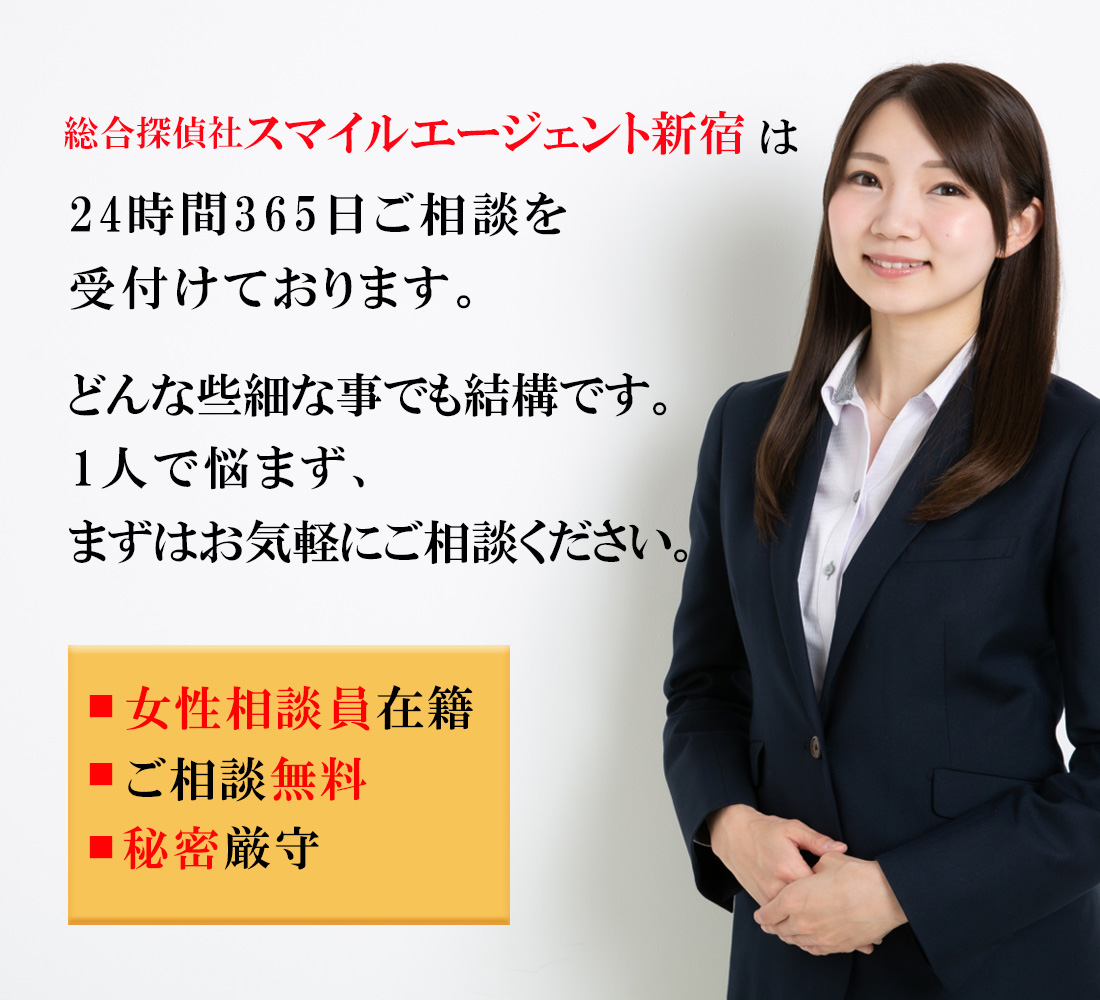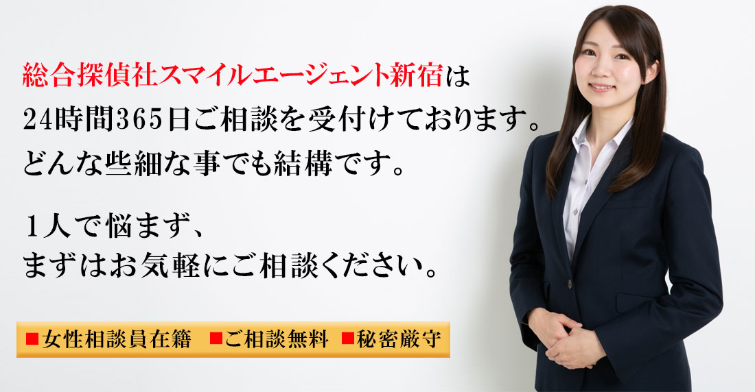 新宿区で不倫・浮気調査や行方調査、ペット捜索などの各種調査で探偵をお探しの際にはご相談・お見積りは無料となっておりますので一度、総合探偵社スマイルエージェント新宿までお気軽にご相談ください。